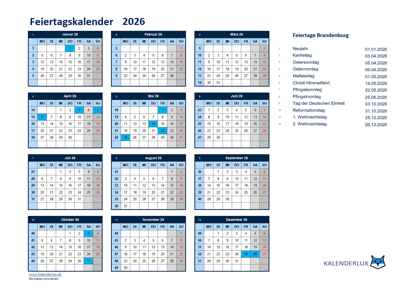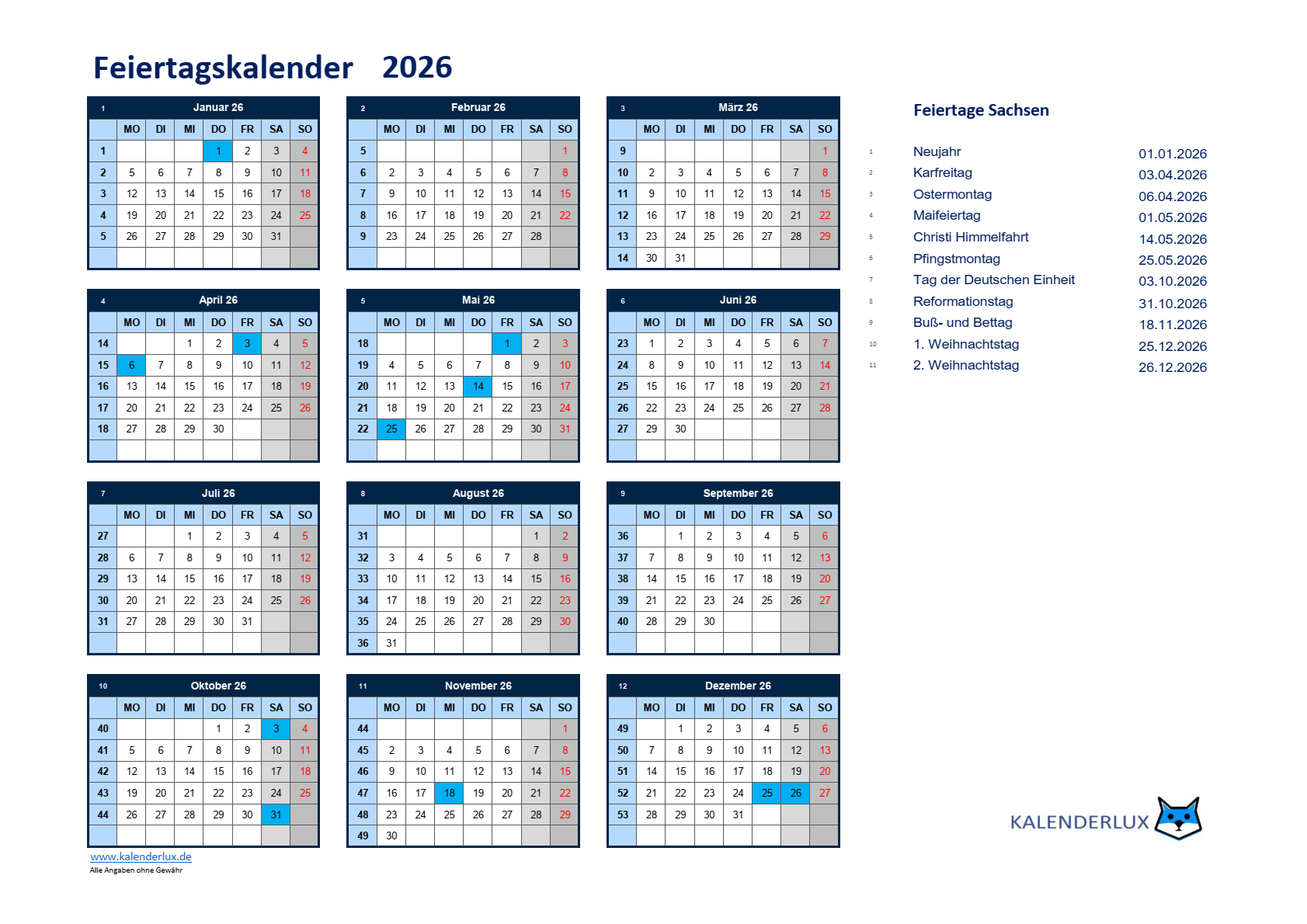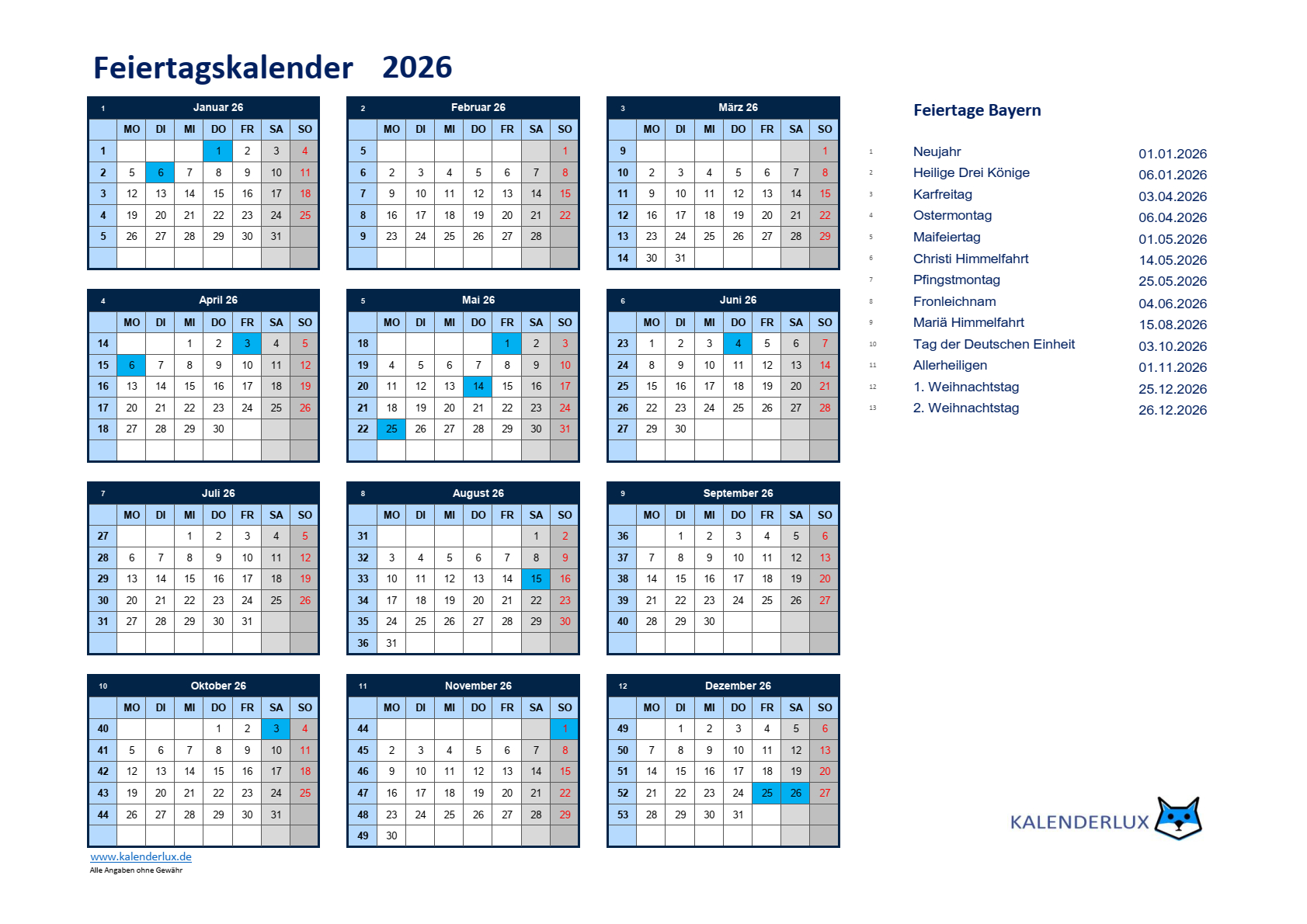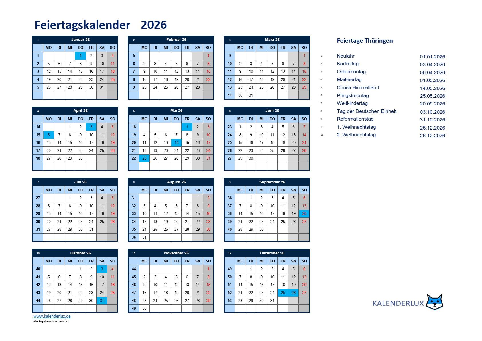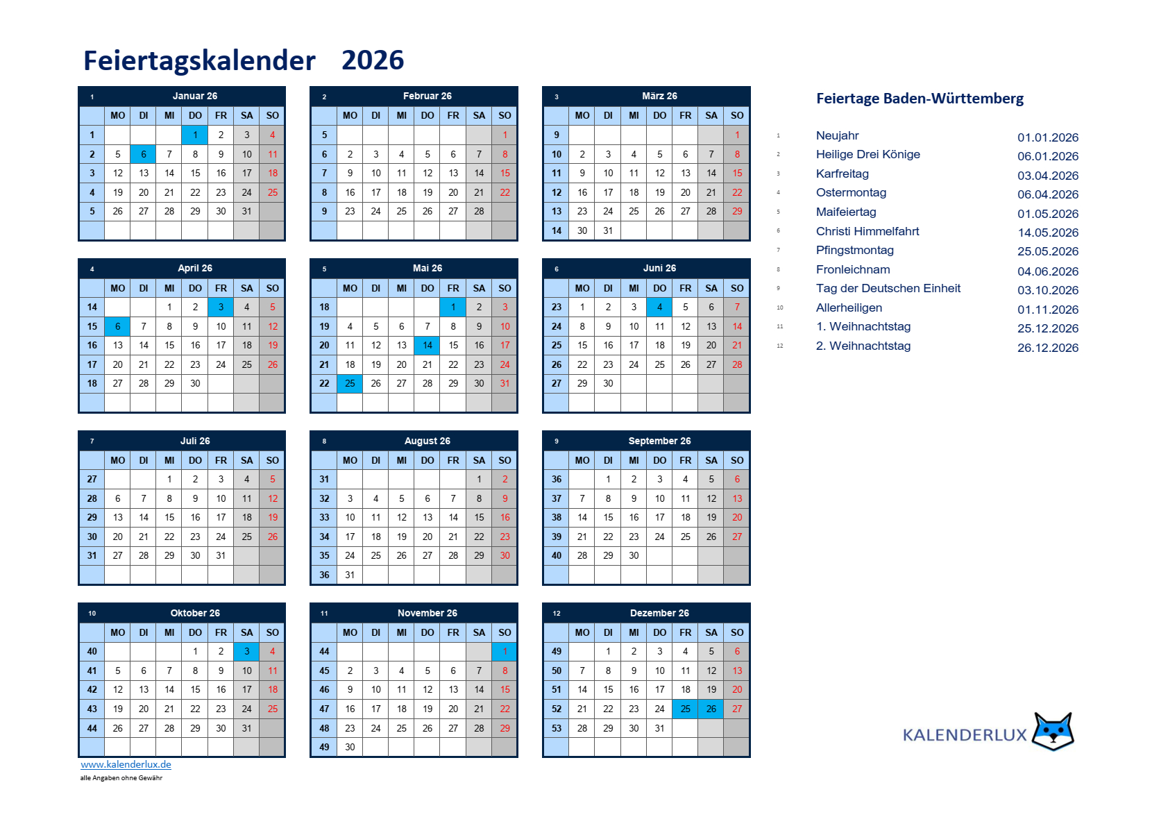 Und nun viel Spaß mit den Feiertagskalendervorlagen für das Jahr 2026.