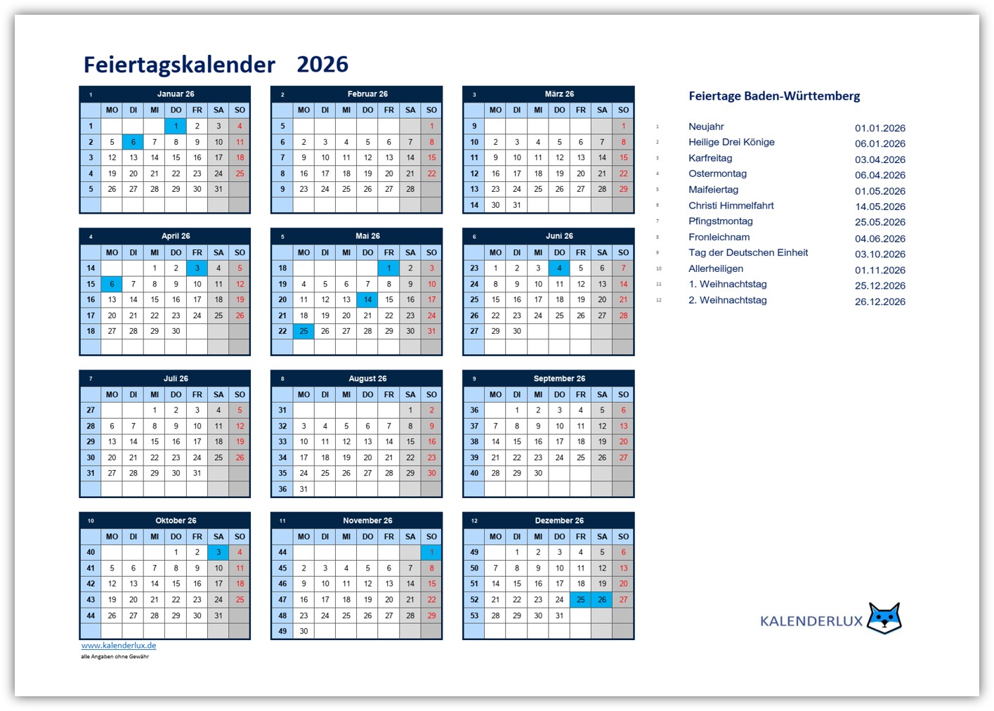 Feiertagskalender 2026 sind für viele Zwecke sehr nützlich. Egal ob du nur wissen möchtest wann ein Feiertag ist oder ob du deine Urlaubsplanung nach Feiertage ausrichten möchtest. Bei Kalenderlux.de wirst du fündig. Schau regelmäßig vorbei, es gibt immer wieder neue Feiertagskalender zu entdecken.