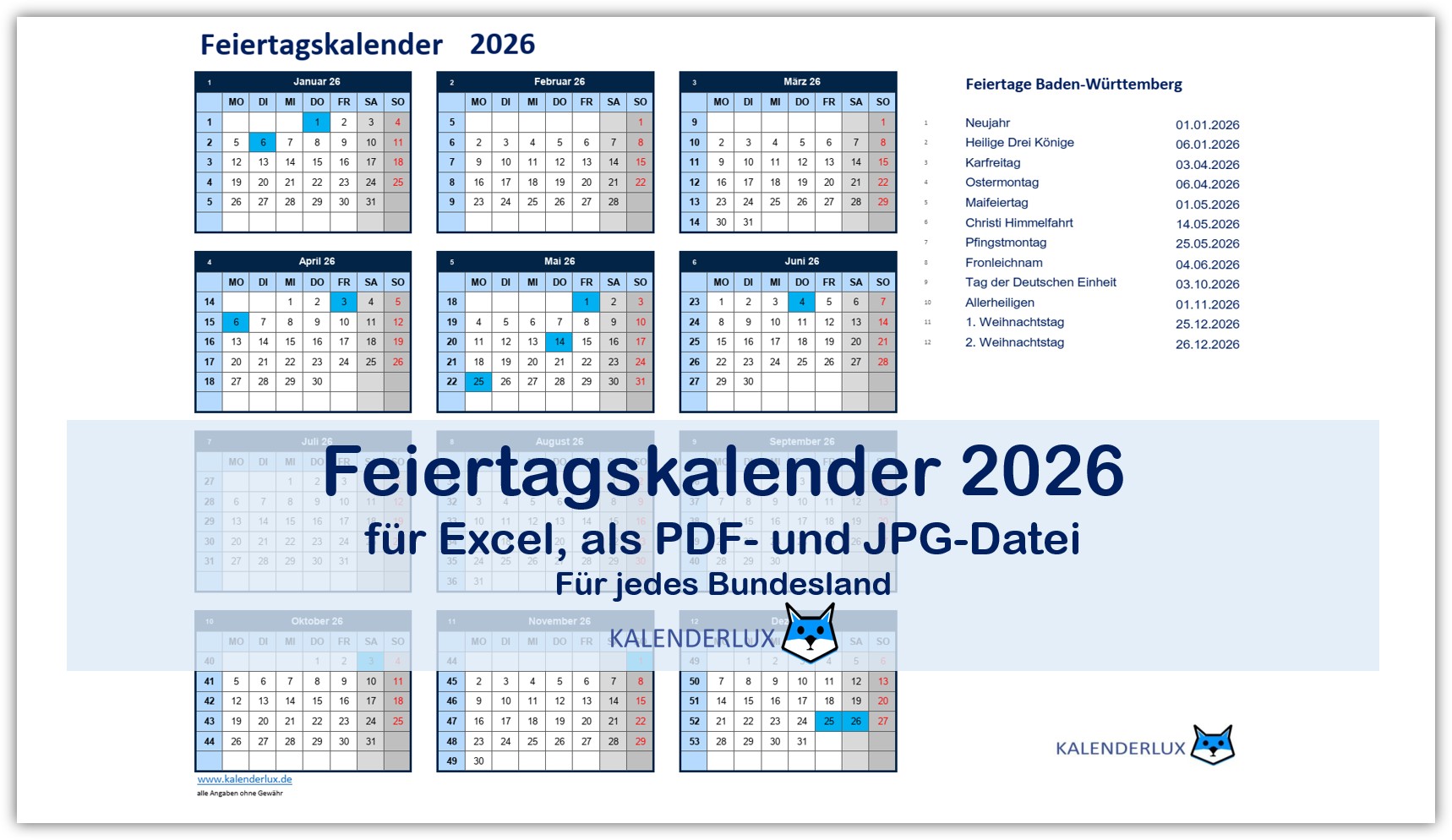 Auf Kalenderlux.de findest du viele schöne und nützliche Feiertagskalendervorlagen für das Jahr 2026 und weitere Jahre. Dank der verschiedenen Formate wie Excel, PDF und auch als JPG-Bildkalender kannst du die Feiertagsvorlagen ganz einfach an deine Bedürfnisse anpassen und übernehmen.