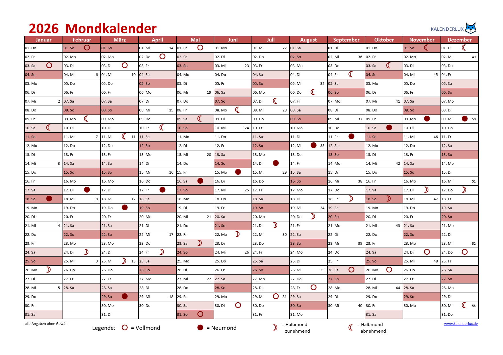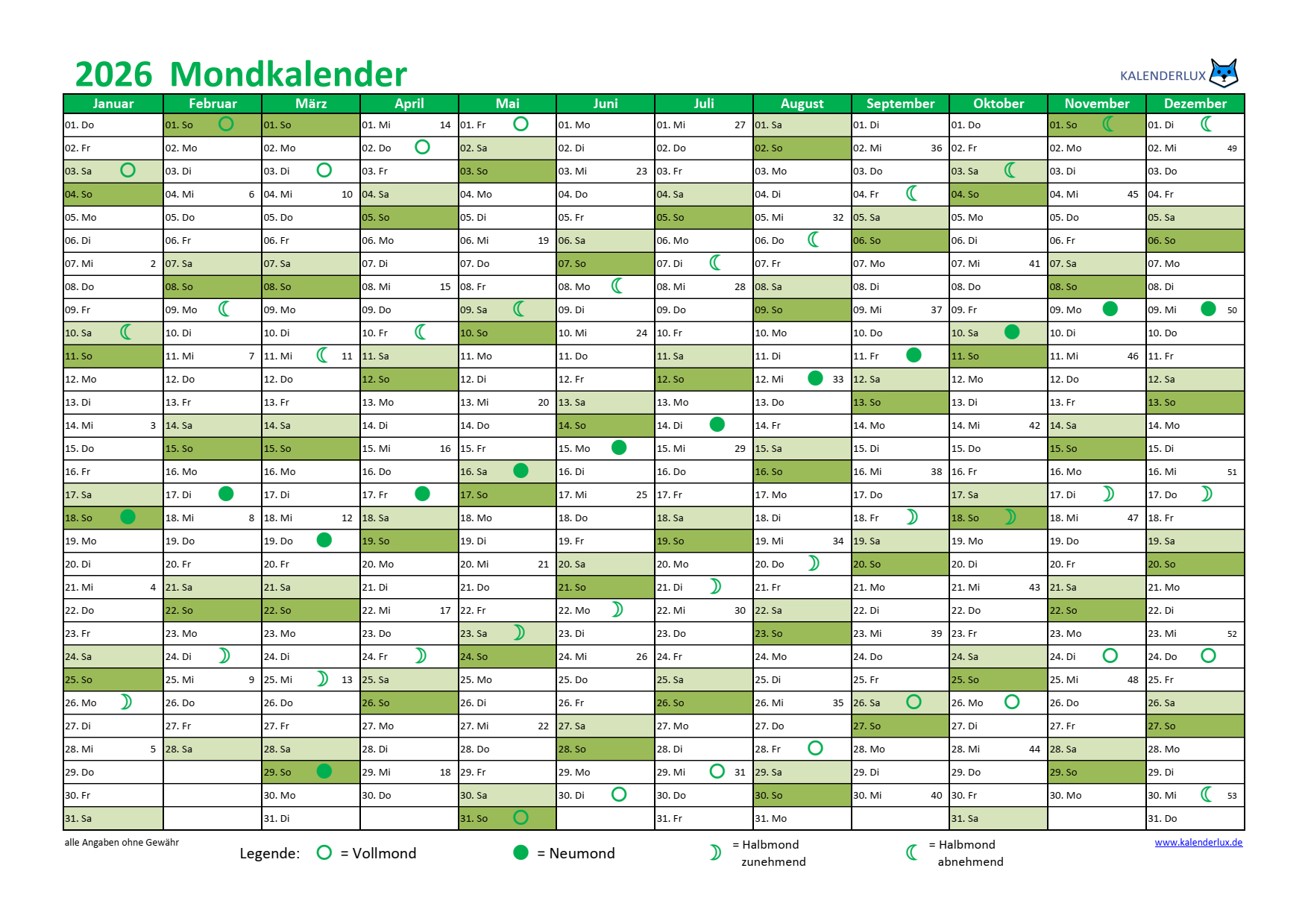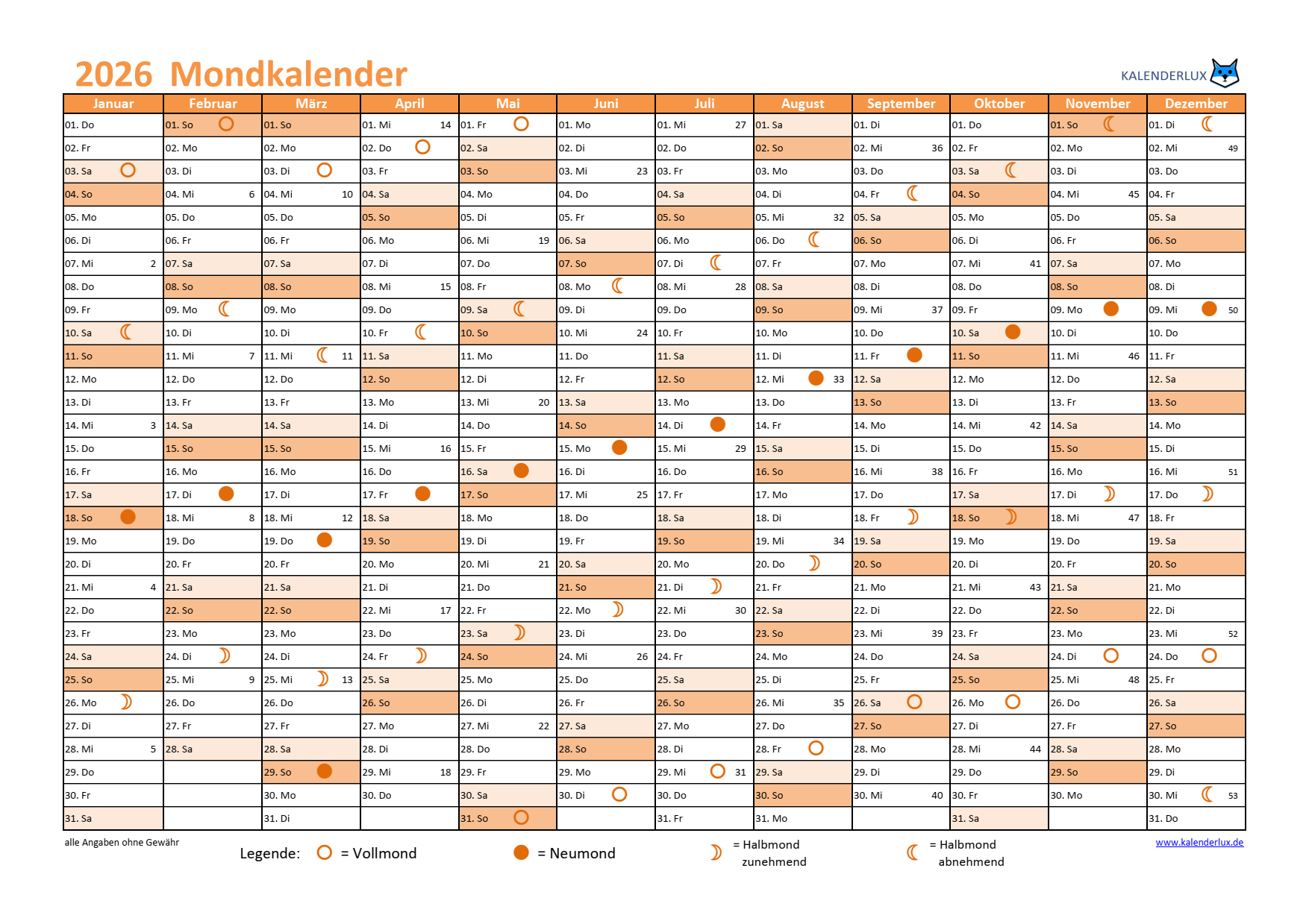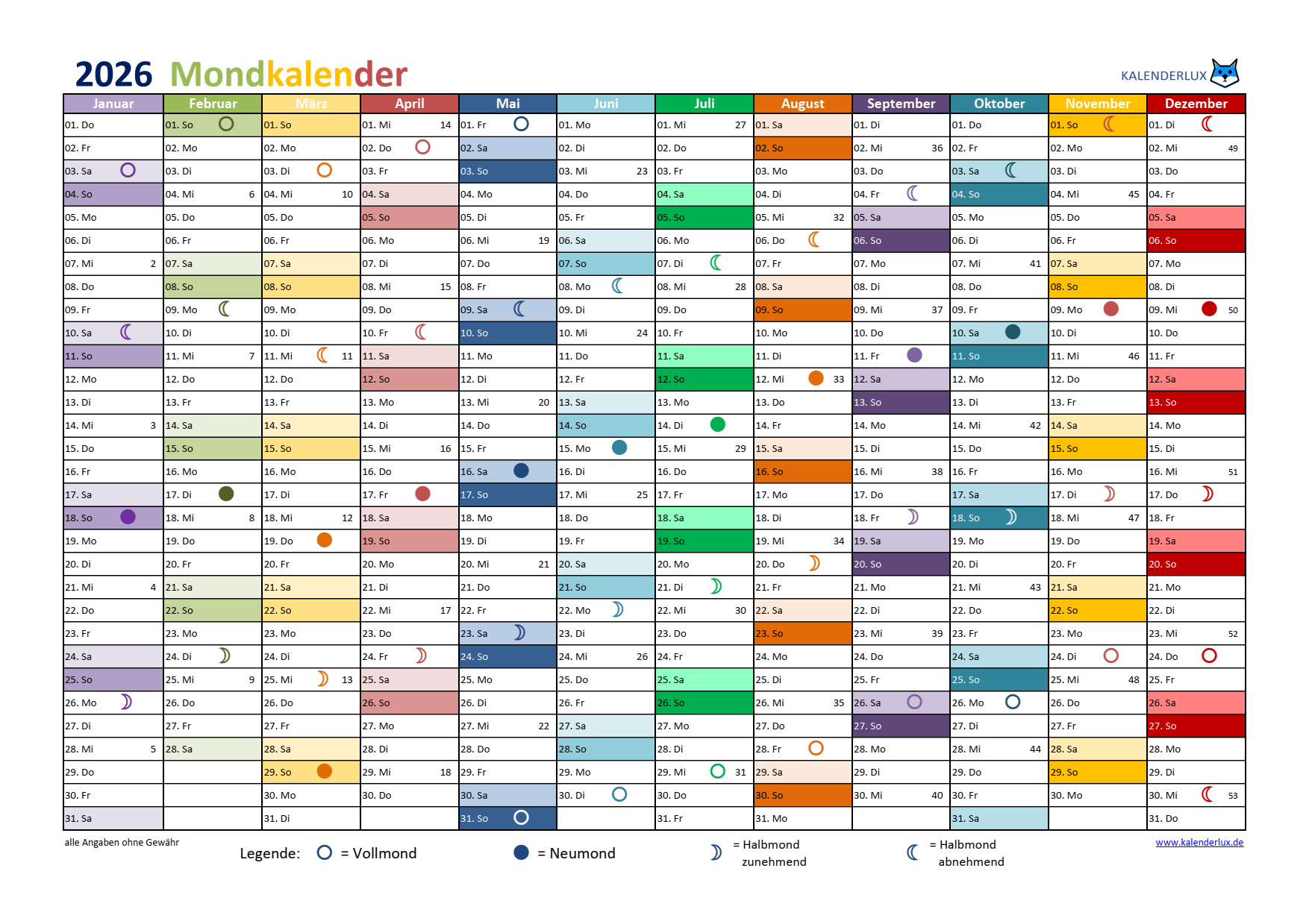 Mondkalender 2026 Vorlagen in verschiedenen Formaten zum herunterladen