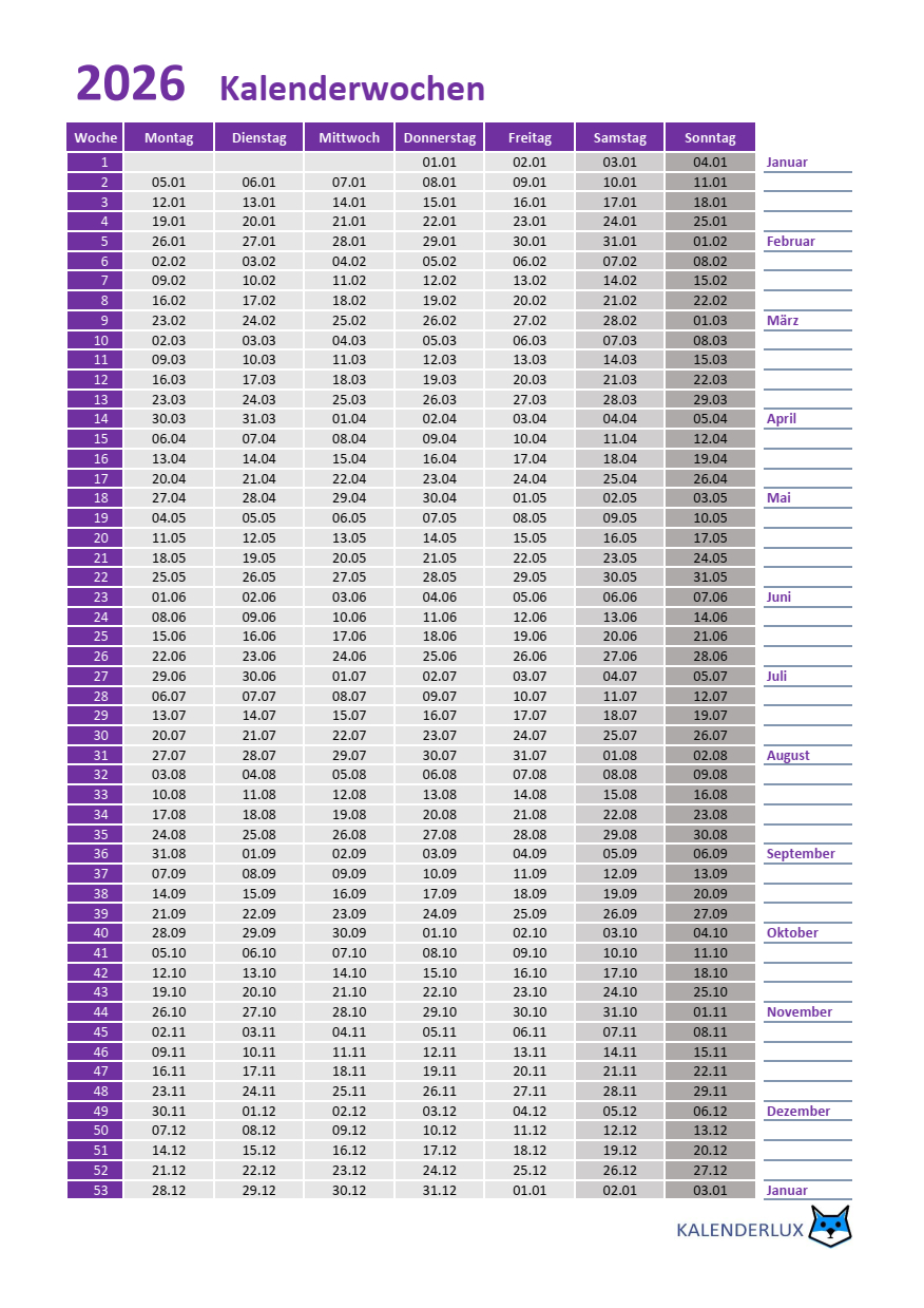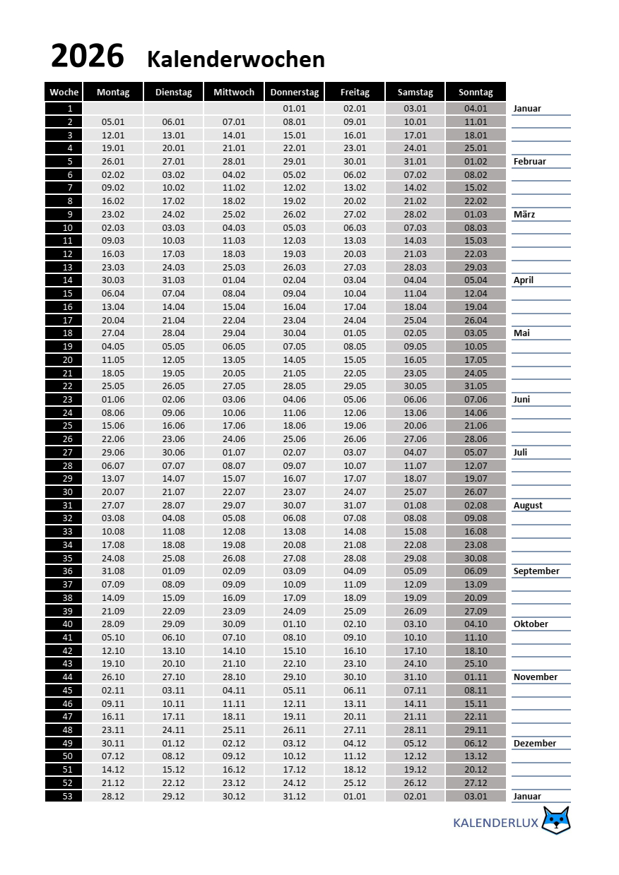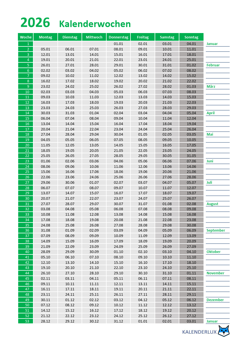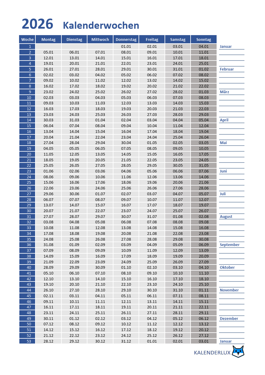 Kalenderwochen 2026 – Kostenlose Vorlagen für Excel, PDF & JPG | Kalenderlux.de