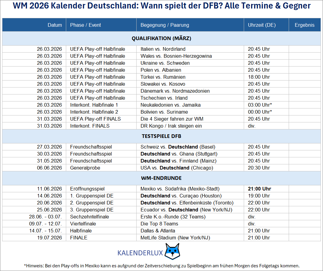 Die Kalendervorlage „WM 2026 Kalender für Deutschland: Wann spielt der DFB? Alle Termine & Gegner“ gibt es als PDF-Datei zum kostenlosen Download. Alternativ kannst du die Tabelle mit den aktuellen Ergebnissen auch immer live bei Kalenderlux.de verfolgen. Wir tragen die Ergebnisse für dich ein.